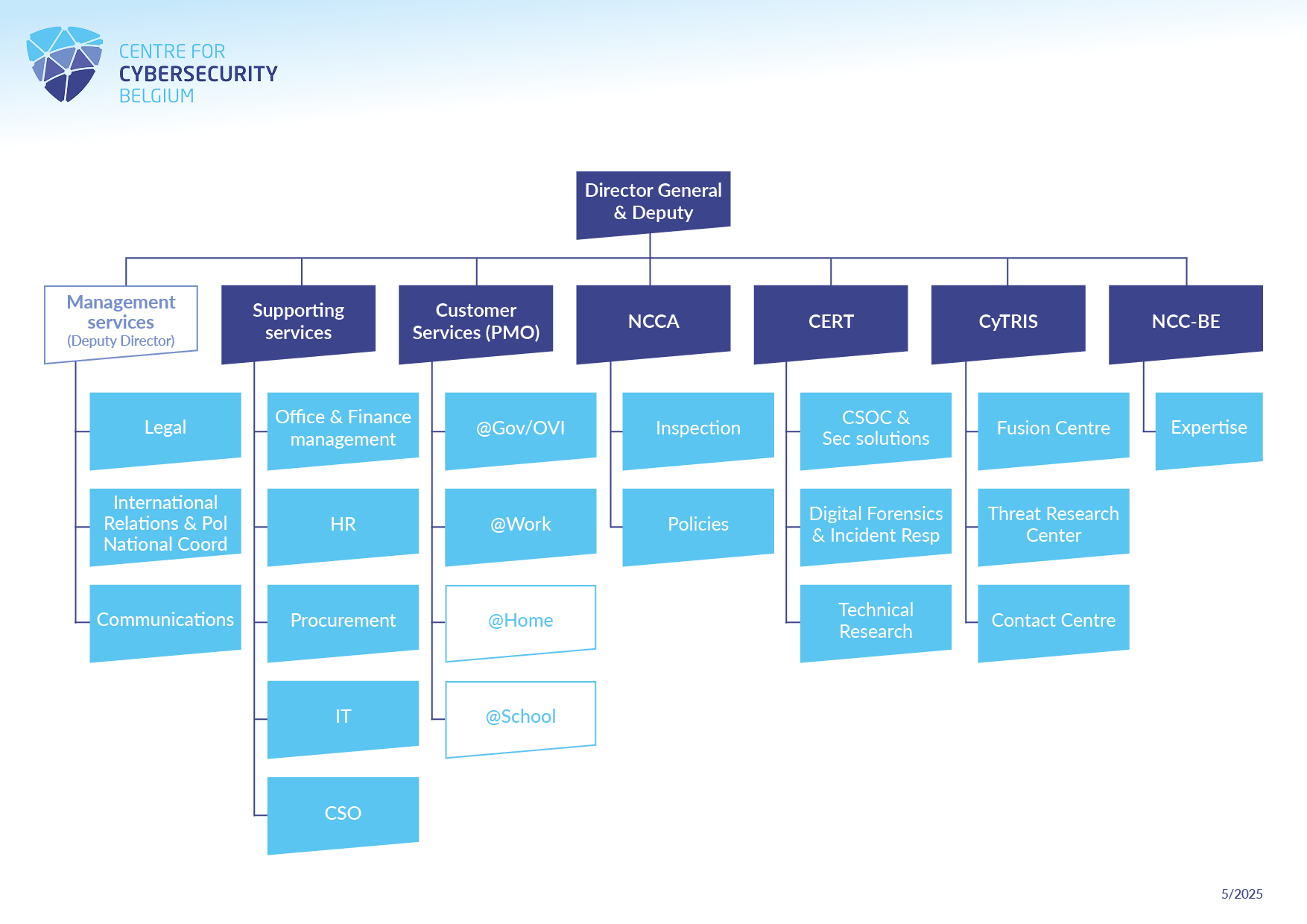 Het Centrum voor Cybersecurity België (CCB) is de nationale cyberbeveiligingsautoriteit in België. Onze wettelijke basis is vastgelegd in het Koninklijk besluit van 14 oktober 2014, die onze kerntaak definieert: het bewaken, coördineren en versterken van de cyberveiligheid in het land. Dit omvat de nationale cyberbeveiligingsstrategie, internationale vertegenwoordiging, en het verhogen van bewustzijn.